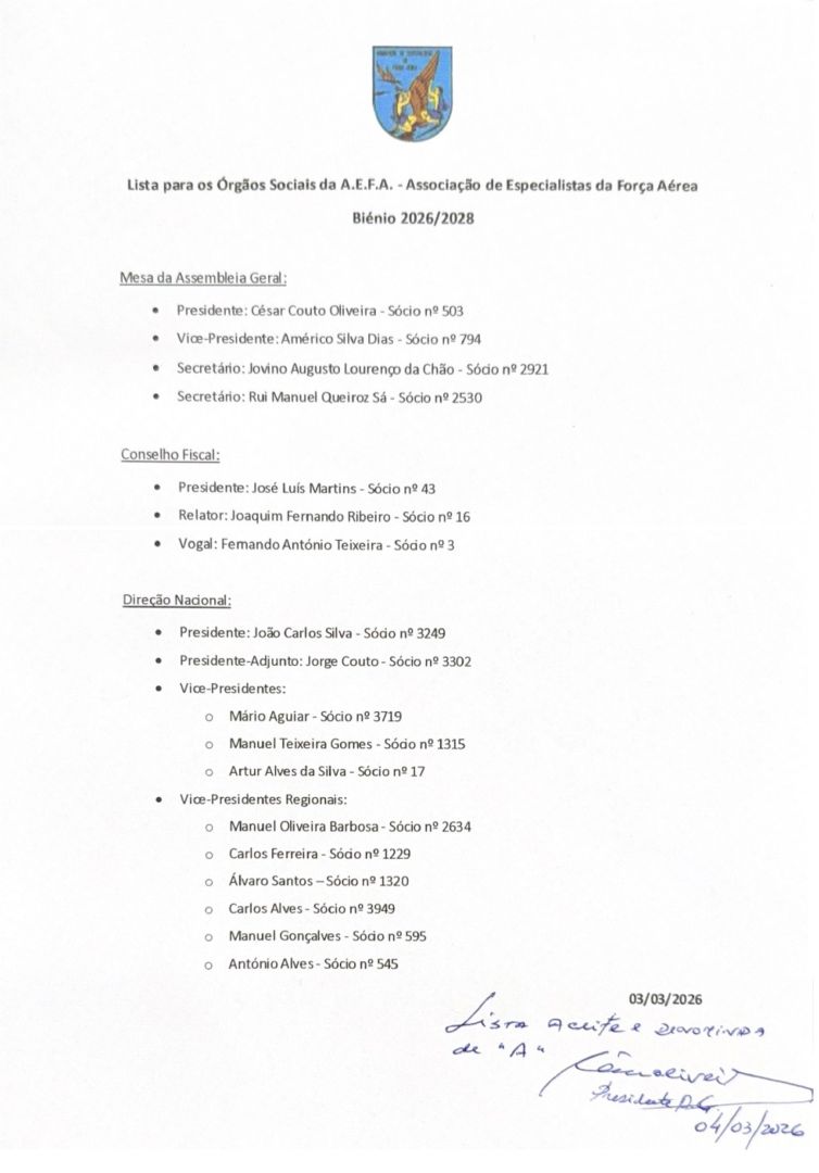 Lista "A" concorrente ao próximo ato eleitoral, na Assembleia Geral de 21 de Março de 2026, para os Órgãos Sociais da Associação de Especialistas da Força Aérea no biénio 2026/2028: